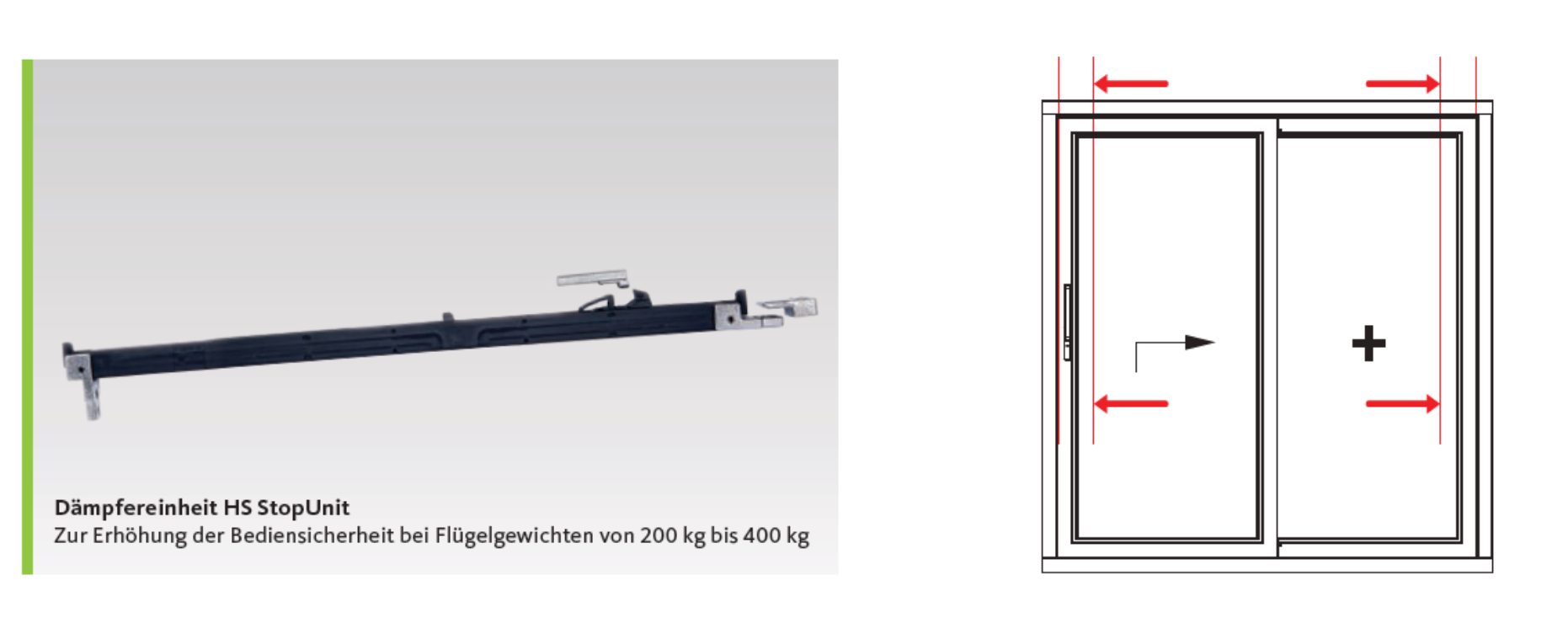 Ciekawym rozwiązaniem montowanym w drzwiach podnoszono-przesuwnych HST jest hamulec StopUnit zwalniający w końcowym etapie przemieszania się skrzydło. Przy jego wykorzystaniu zwiększamy bezpieczeństwo i chronimy się dodatkowo przed ewentualnym przytrzaśnięciem dłoni jak również chroni on ramę przed silnym uderzeniem skrzydła, tym samym zwiększając żywotność drzwi i komfort ich obsługi. Szczególnie polecany jest w miejscach, gdzie drzwi otwierane są bardzo często. Może być wykorzystywany do drzwi w których ciężar skrzydła dochodzi do nawet 400 kg.