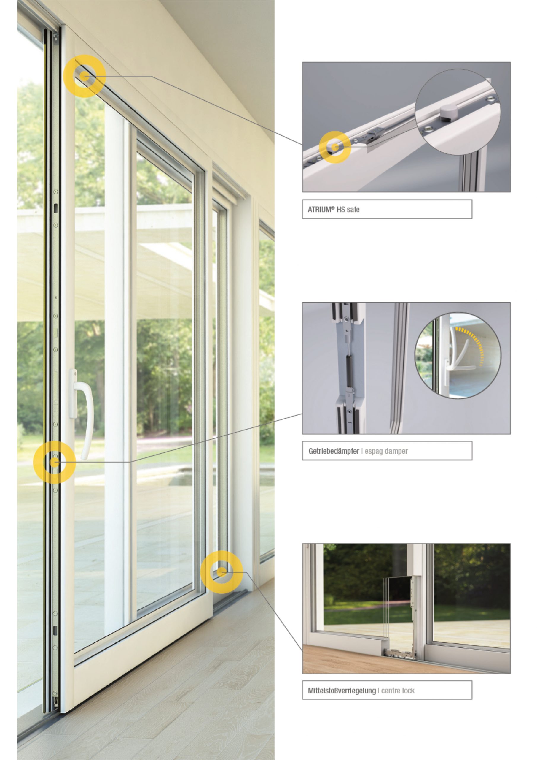 Drzwi podnoszono-przesuwne HST podobnie jak okna mogą mieć zamontowanie okucia w klasie antywyważeniowej RC2. Ich budowa jest natomiast zupełnie inna niż w oknach. W system ATRIUM HS Safe z firmy Hau Tau zostały zastosowane 3 elementy w okuciu podwyższające klasę bezpieczeństwa. Są to bolce (Ausschubbolzen) montowane w górnej części skrzydła, hamulec blokujący możliwość ruchu klamką (Getriebedaempfer) oraz dodatkowy punkt ryglowania (Mittelstossverriegelung), który zapewnia dodatkowe zabezpieczenie pomiędzy progiem i skrzydłem drzwi.
