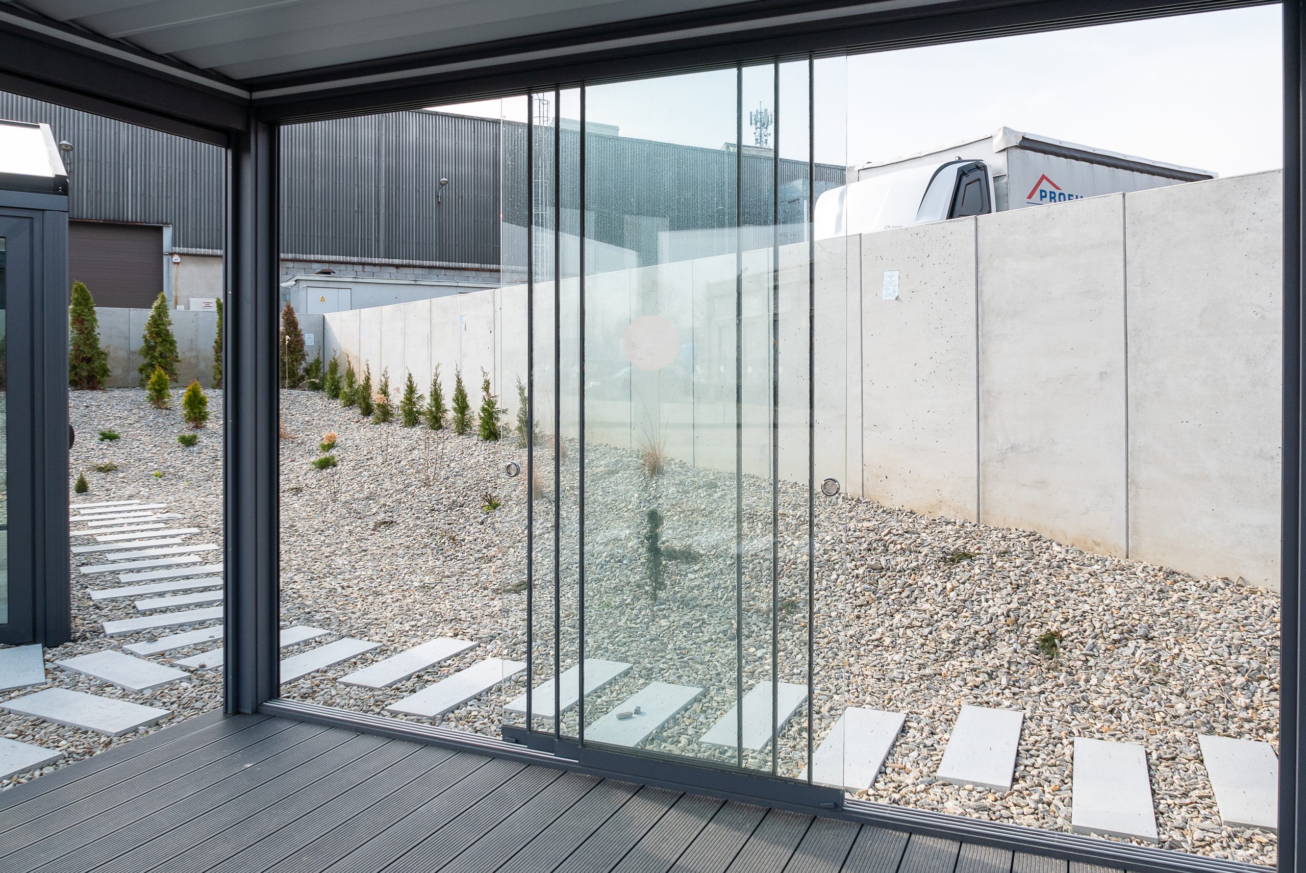 Easy Slide to nieizolowany aluminiowy system drzwi przesuwnych pozwalający na wykorzystanie zadaszonych powierzchni zewnętrznych niezależnie od warunków atmosferycznych i wiatrowych. System przesuwny Easy Slide oferuje szeroki zakres opcji otwierania, a bezramowe skrzydła gwarantują elegancki wygląd i maksymalną przejrzystość. Jego głównymi zaletami są estetyczne skrzydło całoszklane bez konieczności używania profili wokół, możliwość wykonania na dole ramy lub niskiego progu.